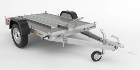 Spezialanhänger für Motorräder mit Kippdeichsel und Auflaufeinrichtung zur Erleichterung der Fahrzeugbeladung. Trägerrahmen aus verzinkten, gebogenen Stahlblechprofilen, die miteinander verschraubt sind. Radverriegelungsgriff des Motorrads für den Transport.