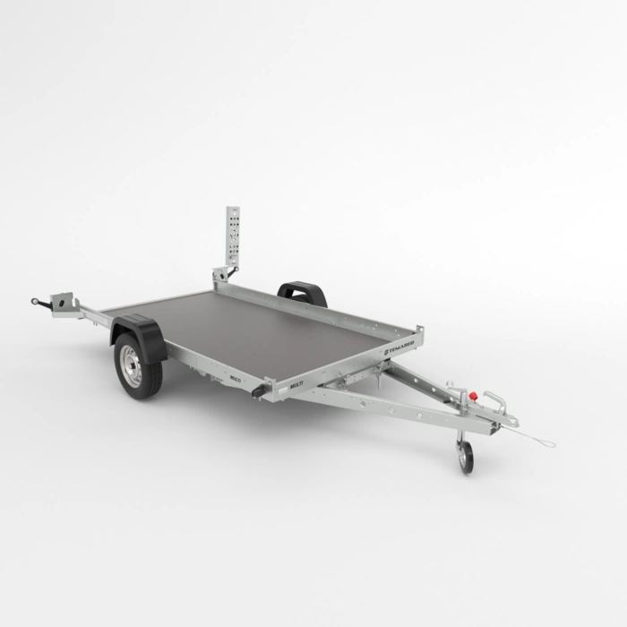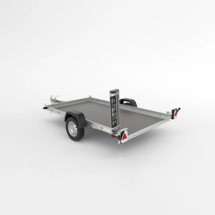 Universeller Transportanhänger mit kippbarer Deichsel für den Transport von Motorrädern, Quads und anderen Kleinfahrzeugen. Der Trailer ist wesentlich breiter als die Trailer der Moto-Serie. Untergestell aus verzinkten, gebogenen und miteinander verschraubten Stahlprofilen. Der Boden besteht aus wasserfestem, rutschfestem Sperrholz. Es ist möglich, Seitenbretter hinzuzufügen, was die Transportkapazität erhöht, und das Überbrett erleichtert den Einstieg in den Anhänger. Die Möglichkeit, einen Kurbelaufzug zu montieren, so dass der Anhänger in der gekippten Position bleibt, wenn das erste Teil geladen wird.